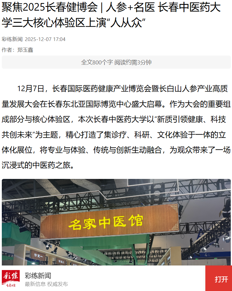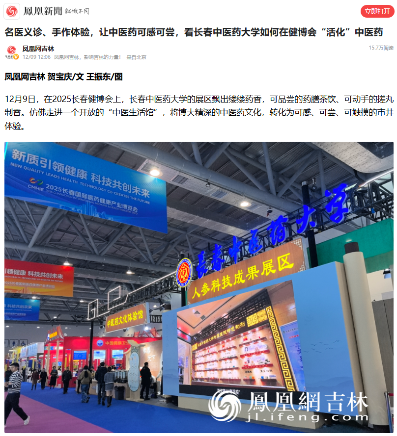 近日,中国日报网、凤凰网、吉林日报彩练客户端等媒体报道我校在2025长春健博会开设“新质引领健康、科技共创未来”主题展区,为民众带来沉浸式的中医药文化体验。